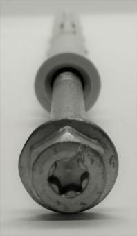 Він застосовується для кріплення легких та важких рамних конструкцій до основи. Шуруп оснащено шестигранною головкою з шайбою, щоб збільшити площу дотику, а також шліцом TORX (зірочка) що дозволяє вкручувати його не злизуючи голівку. Цей комплект забезпечує міцну фіксацію дюбеля в основі за рахунок покращених розпираючих властивостей шурупа, оскільки його різьба спроєктована таким чином, що не прорізає дюбель (на відміну від звичайних гвинтів по дереву).